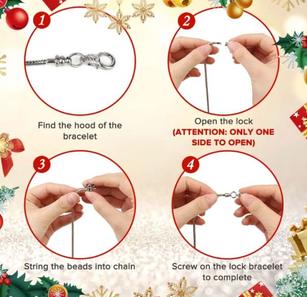 Suurepärane võimalus tüdrukutele, kellele meeldib ise oma ehteid valmistada. See käevõru on kaasahaarav käsitöötegevus pidude ajal, võimaldades tüdrukutel segada ja sobitada helmed ja ripatsid, et isikupärastada oma unikaalne jõulukuulutusega käevõru.