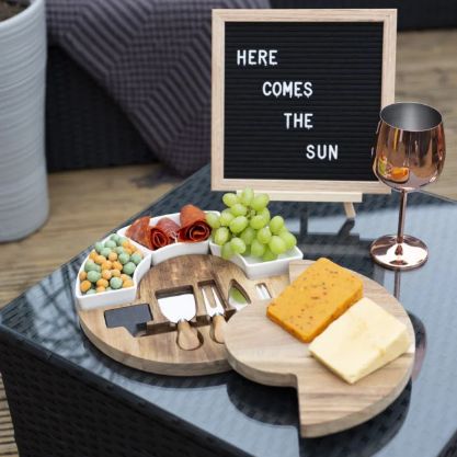 See laud on spetsiaalselt valmistatud juustu serveerimiseks, koos oluliste vahenditega erinevate juustude lõikamiseks. Seejärel saate viilutatud juustud sellel peenel puust laual esitleda.