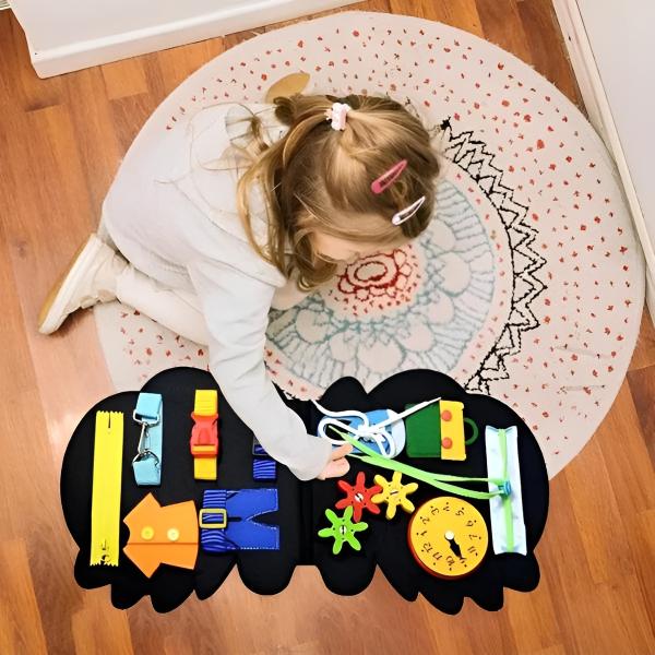 Väikelaps tegeleb tõmblukkude, klambrite, hammasrataste, kellade, kingapaelte ja muuga.
